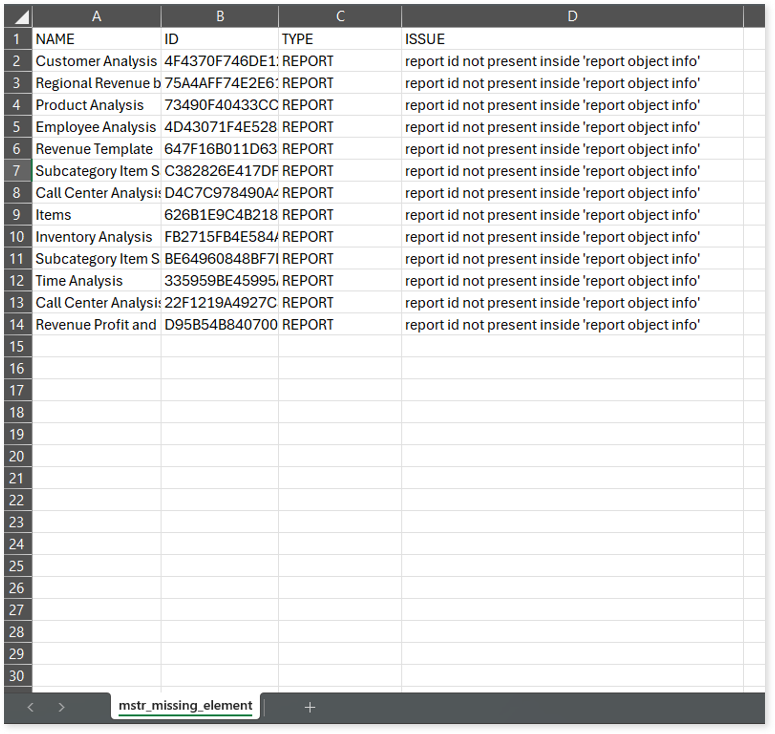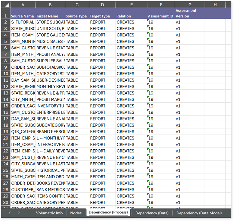 MSTR Assessment.xlsx: This report provides insights about the source inventory. It helps you plan the next frontier of a modern data platform methodically. It includes information about filters, reports, facts, metrics, and more.