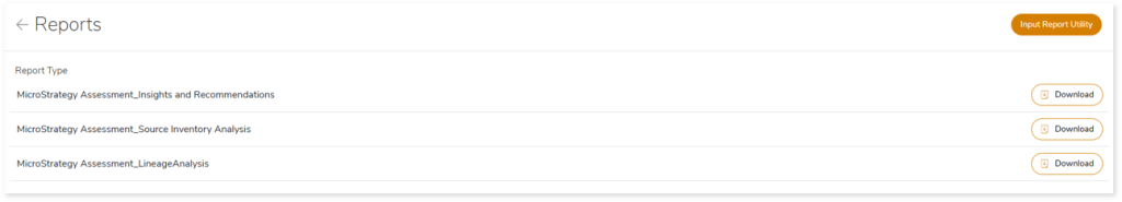 Downloadable reports allow you to export detailed MicroStrategy assessment reports of your source data which enables you to gain in-depth insights with ease. To access these assessment reports, click Reports.