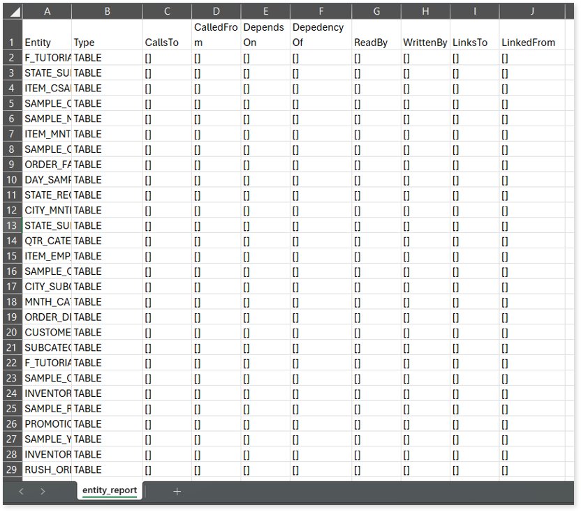 entity_report.csv: This report provides detailed lineage information for each entity within the uploaded source files. It provides a comprehensive list of all entities along with their respective types, identifies the processes, entities, or scripts that read from or write to each entity, and includes other dependency details.