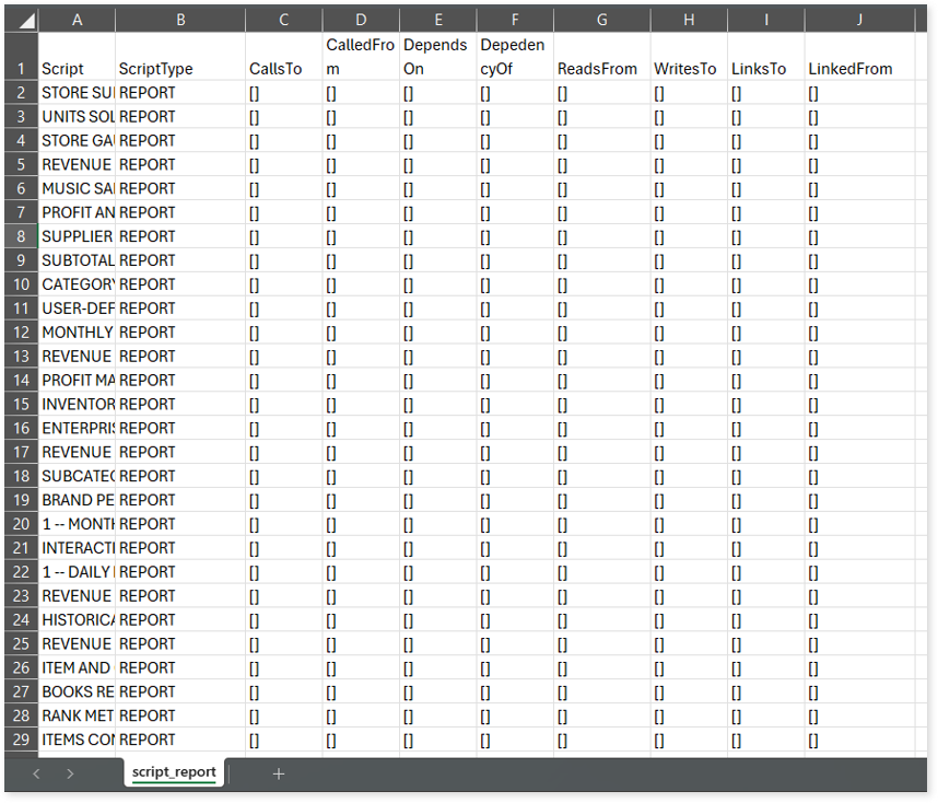 script_report.csv: This report provides detailed lineage information for each script. It lists all scripts along with their type, specifies the processes, entities, or scripts from which each script reads data and those to which it writes, as well as other dependency details.