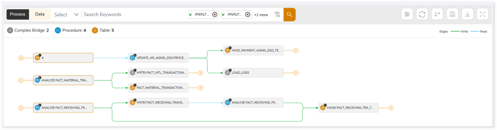 In addition, the filter search icon allows you to include or exclude particular nodes to obtain the required dependency structure. It helps you quickly narrow down complex dependency graphs to focus on the exact nodes, relationships, or data flows you want to analyze. Instead of navigating through an entire lineage network, you can apply filters based on object names, types, or relationship categories—making it easier to isolate specific tables, workflows, or transformation paths. This feature enhances traceability, reduces visual clutter, and enables you to precisely identify upstream or downstream dependencies that are most relevant to your analysis or migration scope.