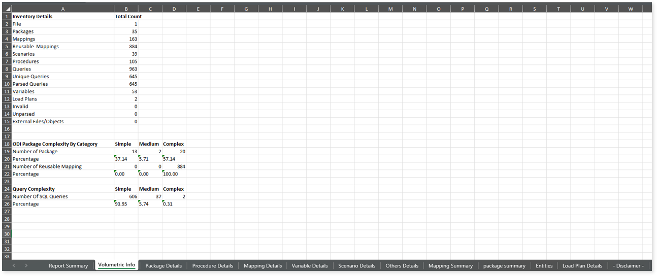 ODI Assessment.xlsx: This report provides insights about the source inventory. It helps you plan the next frontier of a modern data platform methodically. It includes a report summary, package summary, load plan summary, and a lot more.