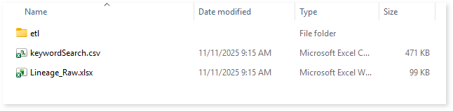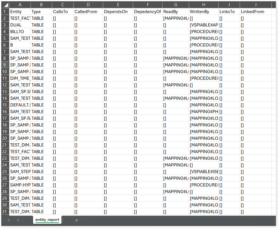entity_report.csv: This report provides detailed lineage information for each entity within the uploaded source files. It provides a comprehensive list of all entities along with their respective types, identifies the processes or scripts that read from or write to each entity, and includes other dependency details.