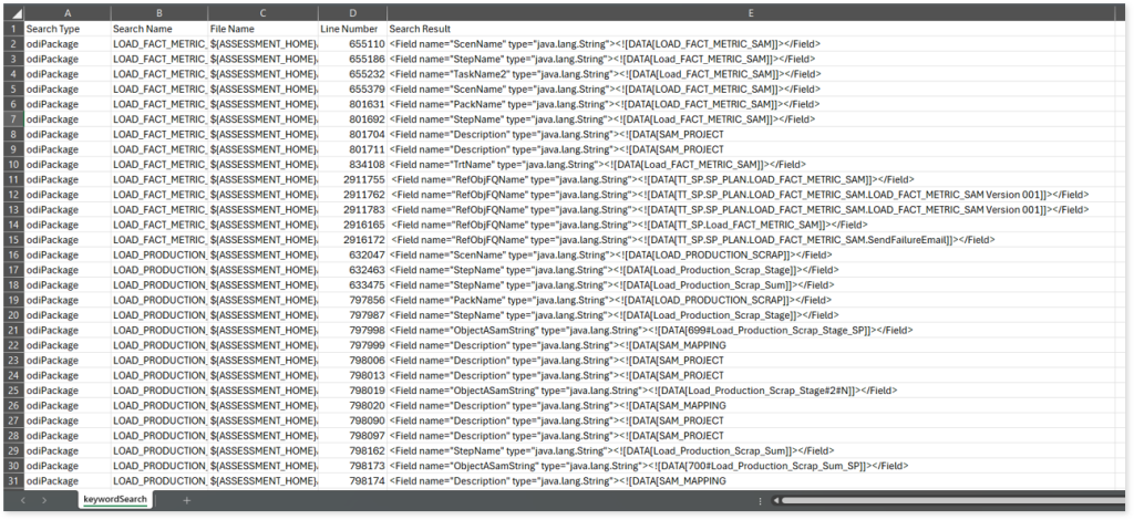 keywordSearch.csv: Provides detailed insights into keyword occurrences— specifically packages—identified across all uploaded source files. It captures information such as the search type, the file where the keyword was found, the line number of occurrence, and the actual line content where the keyword appears.