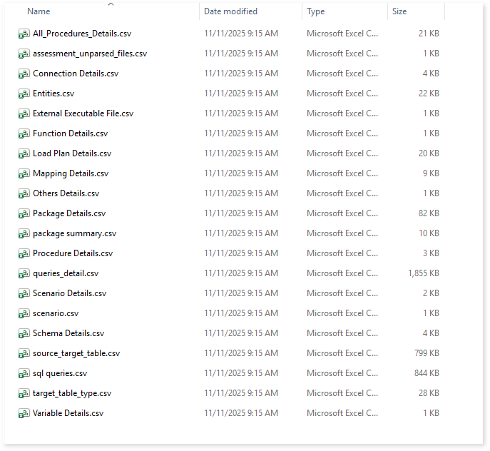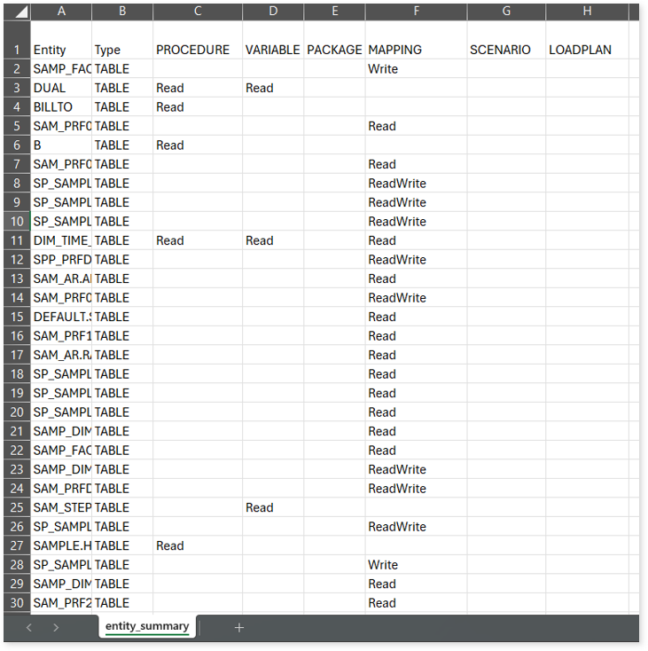 entity_summary.csv: This report provides information about each entity along with the type of relation in which it appears—such as procedures, variables, packages, mappings, etc.,—and the operation performed in that context, including Read, Write, or ReadWrite.