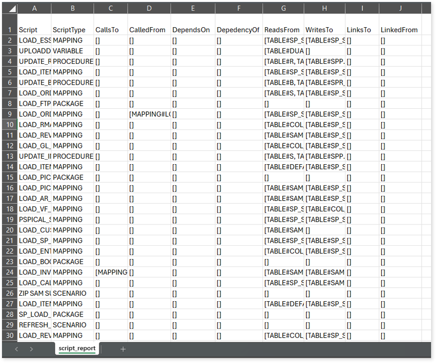 script_report.csv: This report provides detailed lineage information for each script. It lists all scripts along with their types, reads data from or writes data to a process or script, and includes other dependency details.