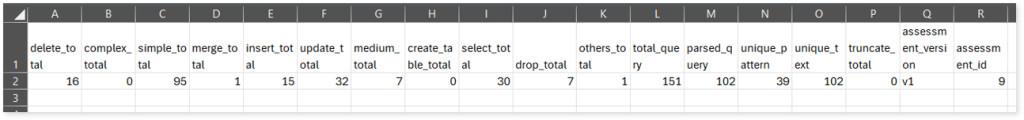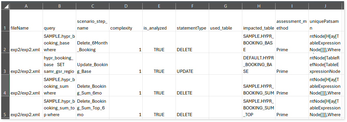 queries_detail.csv: This report provides information about queries including the used and impacted tables, analyzed status, complexity, and more. If the analyzed status is TRUE, it indicates that the query is analyzed successfully. Conversely, a FAIL status indicates that the query is not analyzed.