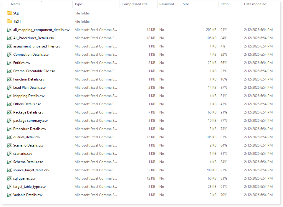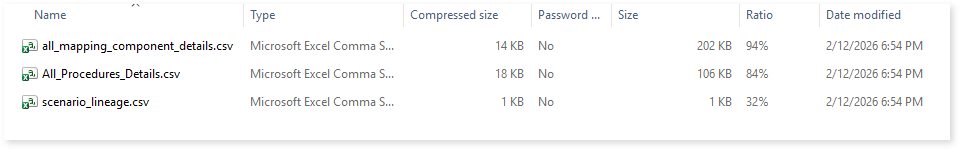 package summary.csv: This report provides comprehensive information about packages along with information about components, mappings, procedures, complexity, and more.