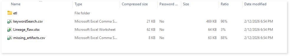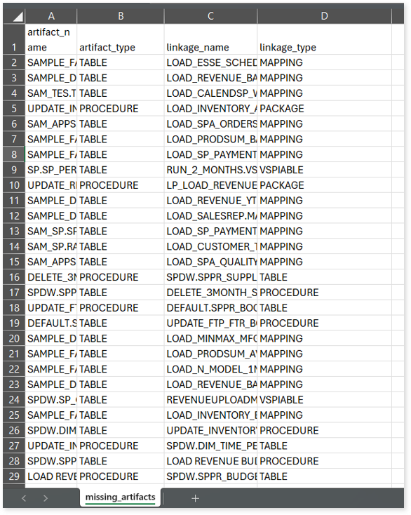 missing_artifacts.csv: This report provides information about missing artifacts—such as tables, procedures, and other components—along with the associated lineage or nodes and the lineage type.
