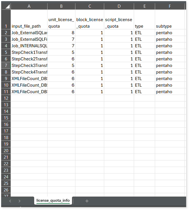license_quota_info.csv: This report provides information about the anticipated license quota deduction when executing a transformation pipeline or notebook using the same source input file that was used during the assessment. It includes details about the expected quota consumption for units, blocks, and scripts.