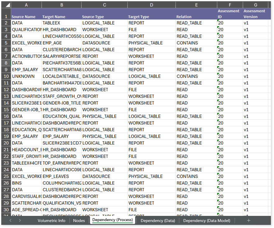 powerbi_summary.csv: This report provides information about the Power BI source input files. It includes information about the total number of sheets, tables, filters, and more.