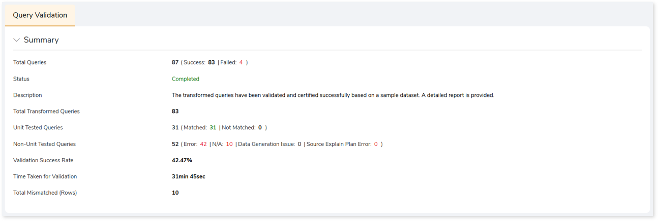- Validated Queries: Number of queries validated along with the status.