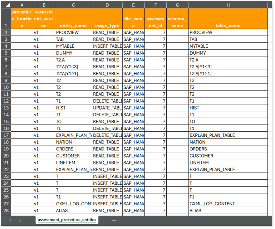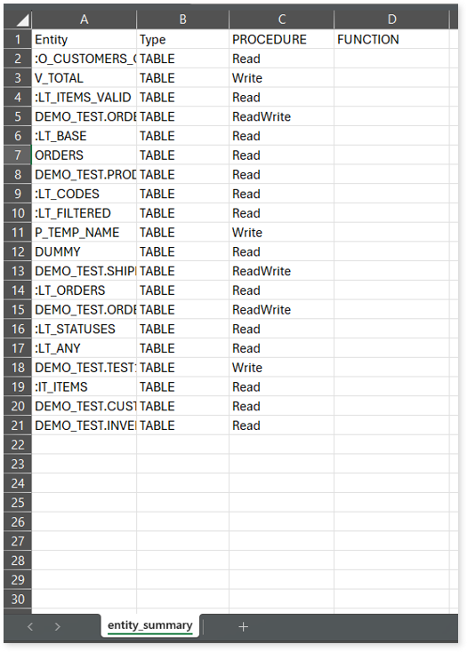 entity_summary.csv: This report provides a list of entities from uploaded source files, indicating where they appear (e.g., procedures and functions) and the operations performed on them—Read, Write, or ReadWrite.