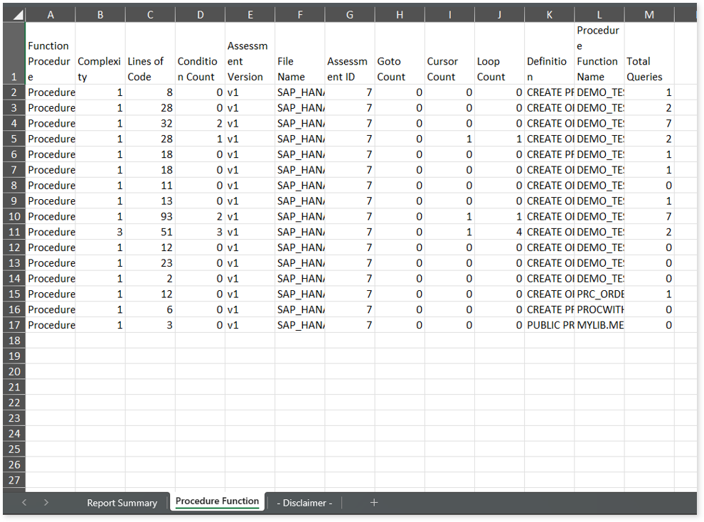 Assessment Procedure Function.xlsx: This report provides information about functions along with statistical information about conditions, goto statements, complexity, and more.