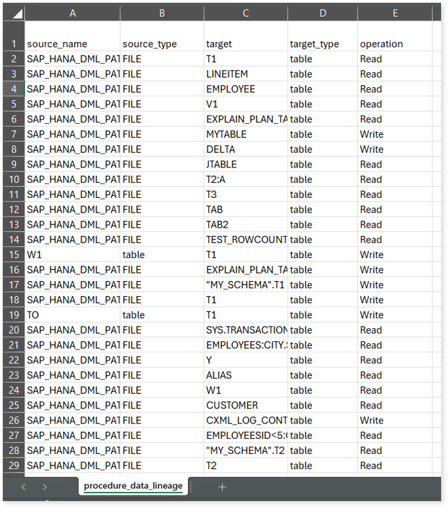procedure_data_lineage.csv: This report provides information about the data lineage of procedures, including details about source and target types, operations, and more.