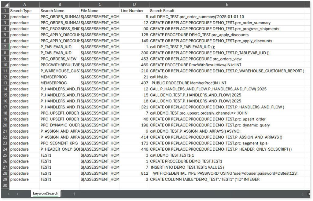 keywordSearch.csv: Provides detailed insights into keyword occurrences— specifically procedures, functions, and macros for Stored Procedure assessment—identified across all uploaded source files. It captures information such as the search type, the file where the keyword was found, the line number of occurrence, and the actual line content where the keyword appears.
