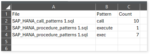 sql_keywords_frequency.csv: This report provides the frequency of patterns such as call, exec, and execute found in stored procedure input files. For example, if function_exec_func appears in a file, it is counted under the exec pattern frequency.