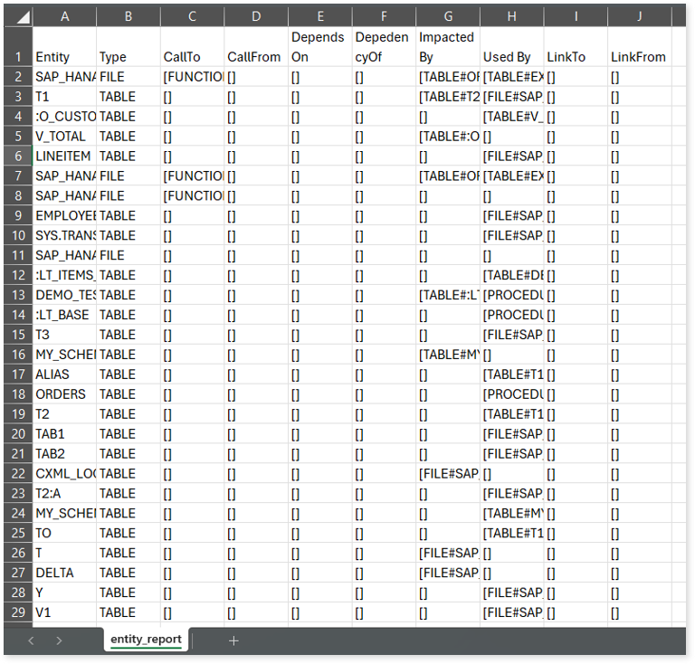 entity_report.csv: This report gives detailed lineage information for each entity in the uploaded source files. It lists all entities along with their types, dependencies, and relationships. The report also shows what each entity depends on, what impacts it, where it is used, and so on.
