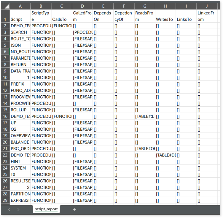 script_report.csv: This report provides detailed lineage information for each script. It lists all scripts along with their type, specifies the processes, entities, or scripts from which each script reads data and those to which it writes, as well as other dependency details.