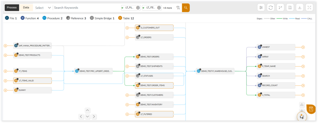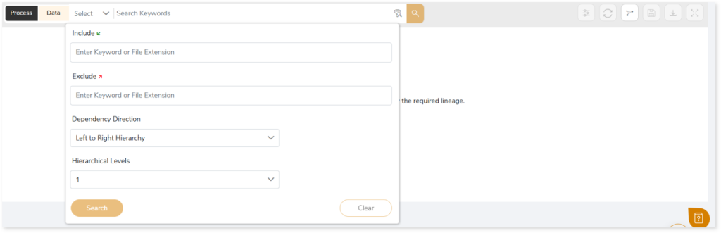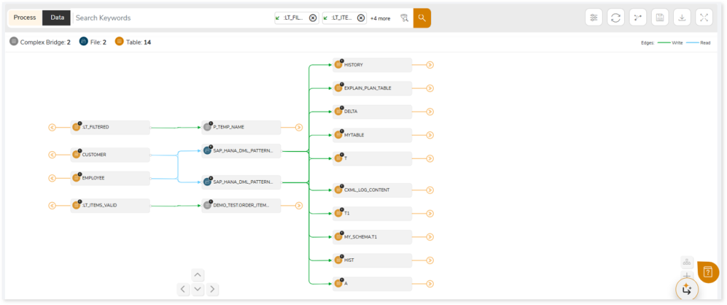 In addition, the filter search icon allows you to include or exclude particular nodes to obtain the required dependency structure. It helps you quickly narrow down complex dependency graphs to focus on the exact nodes, relationships, or data flows you want to analyze. Instead of navigating through an entire lineage network, you can apply filters based on object names, types, or relationship categories—making it easier to isolate specific tables, workflows, or transformation paths. This feature enhances traceability, reduces visual clutter, and enables you to precisely identify upstream or downstream dependencies that are most relevant to your analysis or migration scope.