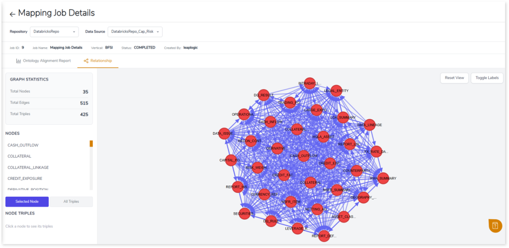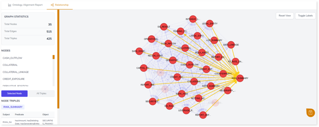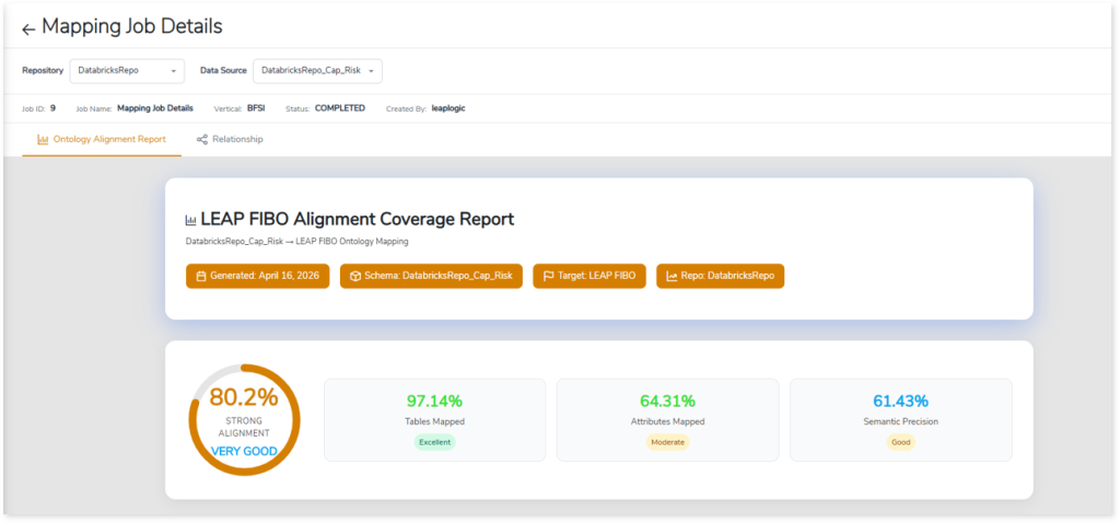 The Ontology Mapping Report provides a detailed view of ontology alignment results, including the Ontology Alignment Report for coverage, semantic precision, and mapping quality, along with Relationships, which provide a graph‑based representation of the ontology. This view enables you to explore how tables, attributes, and entities are interconnected across the data landscape.