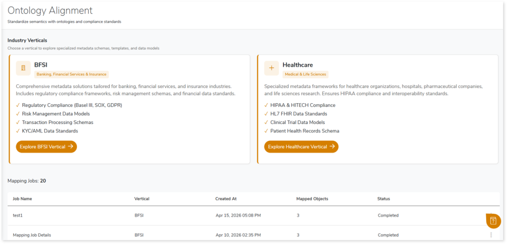 Semantic Harmonization aligns enterprise metadata with industry-specific ontologies and compliance frameworks to ensure consistent and accurate interpretation across data sources, schemas, and repositories. Instead of applying static industry labels, it maps customer data models to relevant domain standards—such as financial, healthcare, or other regulatory ontologies—based on the selected business context.