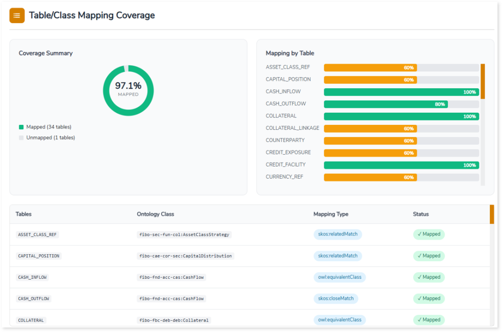 The Table/Class Mapping Coverage section provides visibility into how enterprise tables are mapped to ontology classes (such as FIBO), summarizing table level alignment and overall coverage. This view enables you to quickly assess semantic adoption and identify gaps in coverage.