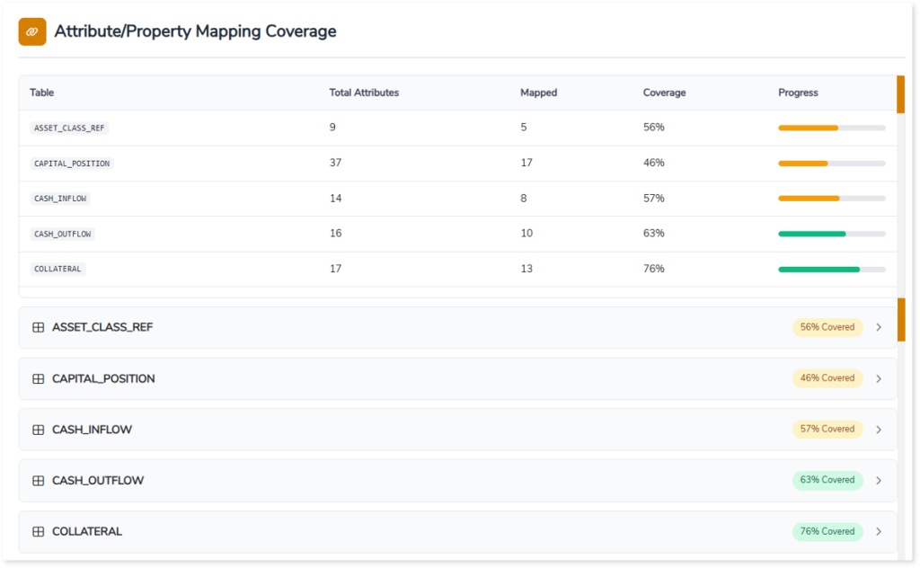 The Attribute/Property Mapping Coverage section provides visibility into how table attributes are mapped to ontology properties. It summarizes attribute level alignment by displaying the total number of attributes, mapped attributes, coverage percentages, and progress indicators for each table. This view enables you to quickly gauge the depth of semantic standardization across datasets.