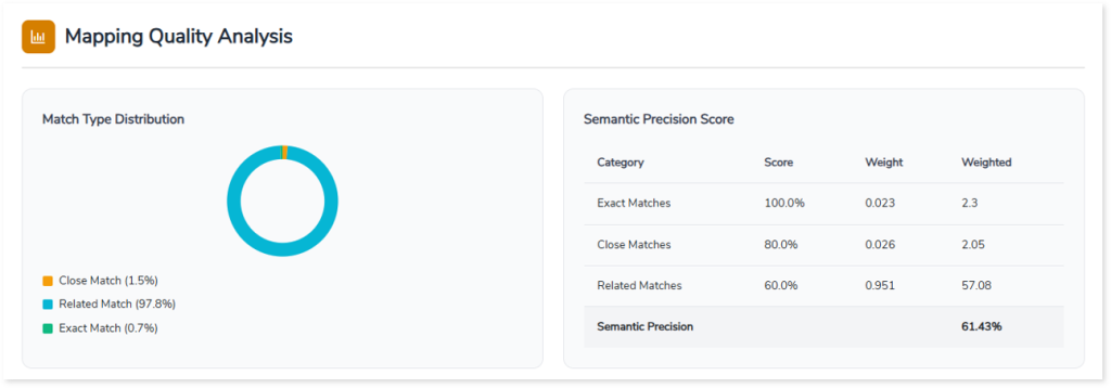 The Mapping Quality Analysis section provides insight into the quality and accuracy of ontology mappings by analyzing how enterprise metadata aligns with ontology concepts. It presents the distribution of match types—such as exact, close, and related matches—and calculates an overall Semantic Precision Score.