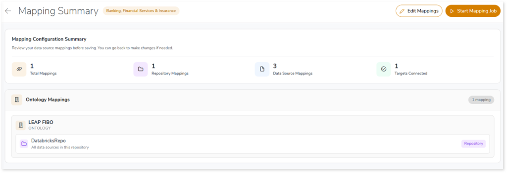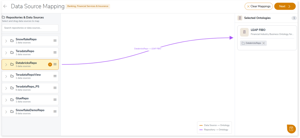 - On the Data Source Mapping page, map data sources or repositories to the selected ontologies.