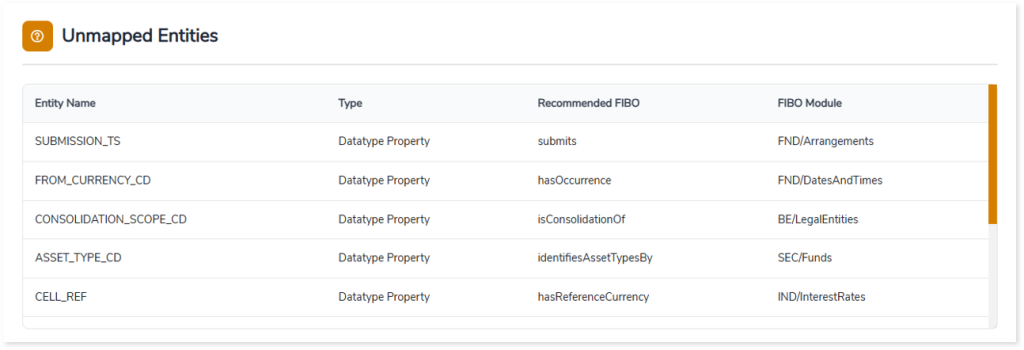 The Unmapped Entities section highlights enterprise entities that have not been mapped to the selected ontology during the alignment process. It lists unmapped tables or attributes along with their entity type and provides recommended ontology concepts (for example, FIBO properties or classes) to guide potential mappings.