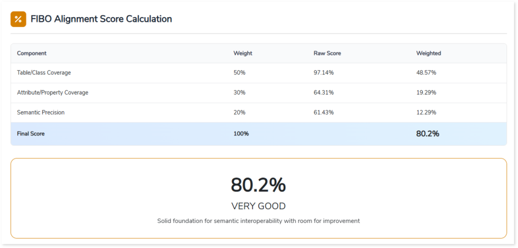 The FIBO Alignment Score Calculation section consolidates ontology alignment results into a single, enterprise-ready score by combining Table/Class Coverage, Attribute/Property Coverage, and Semantic Precision. Each component is weighted to reflect its relative importance in achieving standardization.