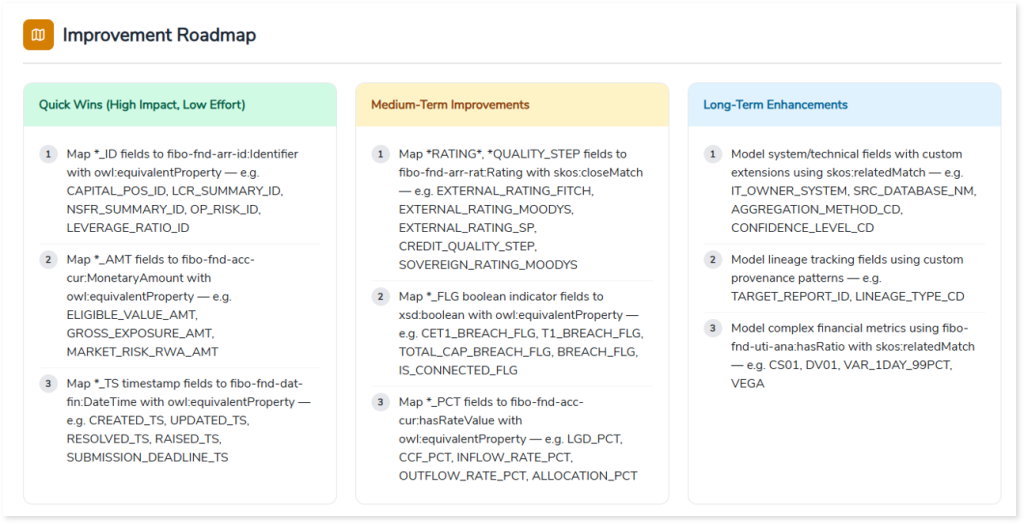 The Improvement Roadmap presents a structured set of recommendations to improve ontology alignment, organized into Quick Wins, Medium Term Improvements, and Long-Term Enhancements. Each category highlights specific actions to address gaps in coverage, accuracy, and semantic depth. By providing targeted recommendations for mapping identifiers, financial attributes, technical fields, and complex metrics, it helps you systematically improve coverage, precision, and overall semantic maturity in a phased, actionable manner.
