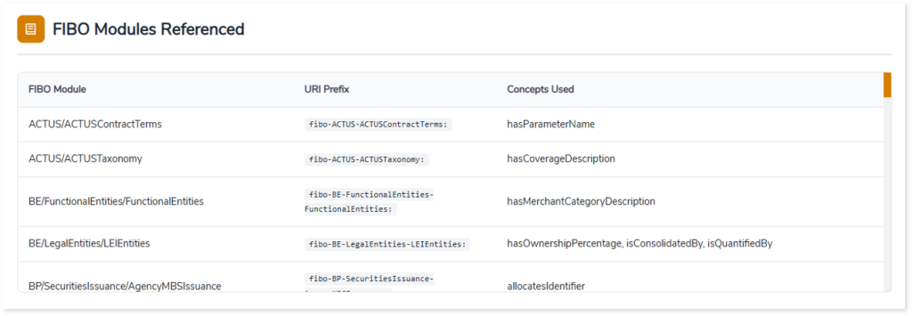 The FIBO Modules Referenced section lists the Financial Industry Business Ontology (FIBO) modules used during ontology alignment. It provides visibility into the specific ontology modules, their URI prefixes, and the business concepts or properties referenced in the mapping process.