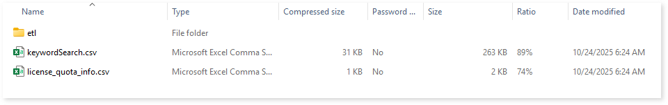 license_quota_info.csv: This report provides information about the anticipated license quota deduction when executing a transformation pipeline or notebook using the same source input file that was used during the assessment. It includes details about the expected quota consumption for units, blocks, and scripts.