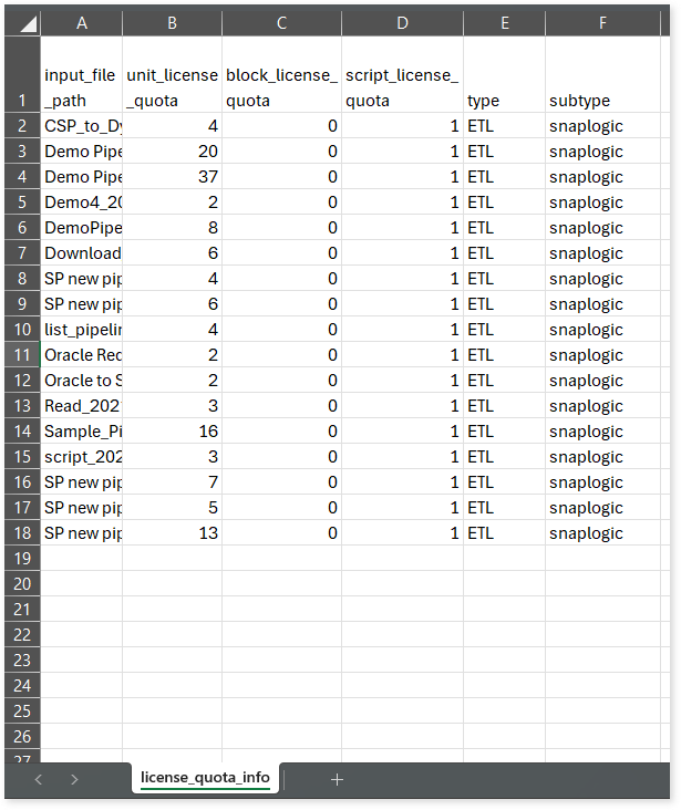 Pipeline Detail Snaplogic.csv: This report provides information about pipelines including information about components, component types, and more.