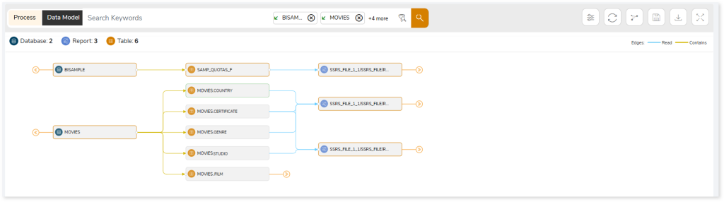 - Dependency (Data Model): Provides dependency details about the data models. It highlights the end-to-end relationships and dependencies between model elements (databases, entities and reports), helping users understand structure and trace linkages.