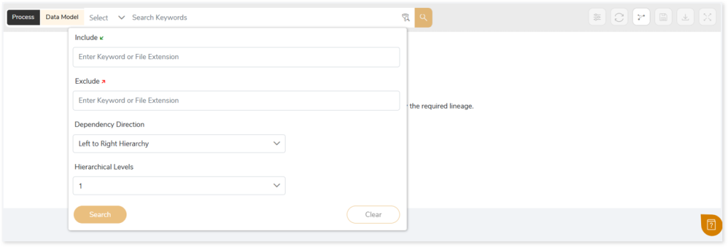 In addition, the filter search icon allows you to include or exclude particular nodes to obtain the required dependency structure. You can also choose the direction of the lineage. By default, the Dependency Direction is Left to Right Hierarchy. You can also choose Right to Left Hierarchy or Bidirectional dependency directions as required. Moreover, you can also increase the Hierarchy Levels to nth level.