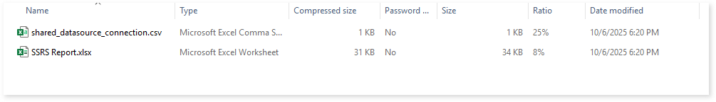 Here, you can see the sql folder along with query_details_db.csv, shared_datasource_connection.csv, and SSRS Report.xlsx.