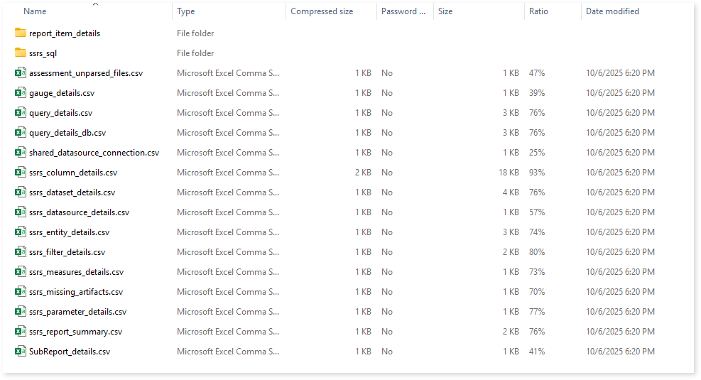 assessment_unparsed_files.csv: This report lists all the unparsed SSRS files along with the reason for parsing failure.