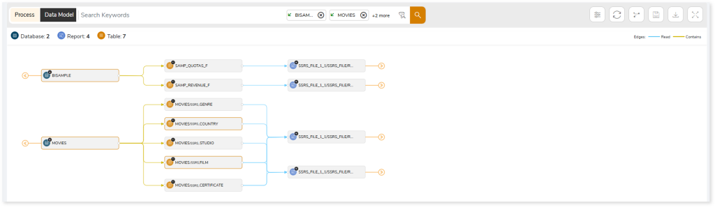 - Data model shows the end-to-end relationships and dependencies between elements (databases, entities, reports).