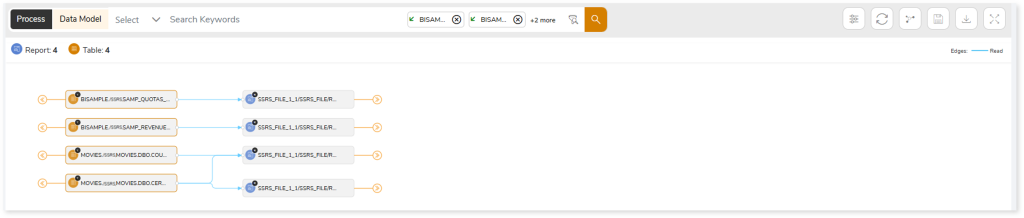 - Process lineage illustrates the dependencies between two or more processes such as entities and reports.