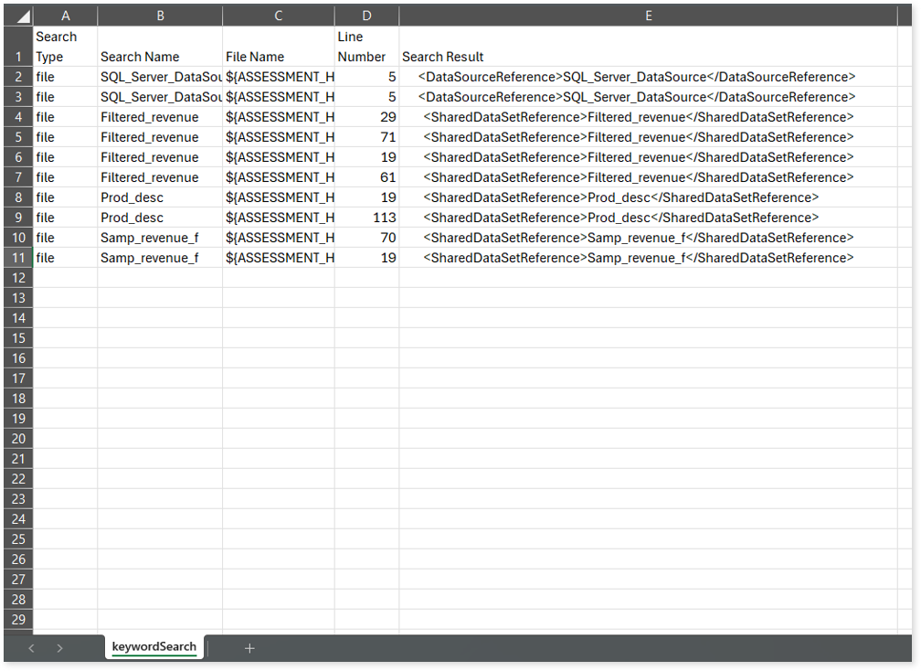 keywordSearch.csv: This report provides information about all the identified files using the file keyword search across uploaded source files. It includes details such as the search type, the file that contains the search keyword, the line number where it occurs, and other related information for each keyword.