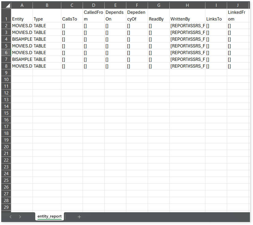 entity_report.csv: This report provides detailed lineage information for each entity within the uploaded source files. It provides a comprehensive list of all entities along with their respective types, identifies the processes, entities, or scripts that read from or write to each entity, and includes other dependency details.