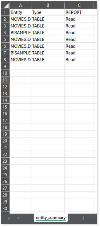 entity_summary.csv: This report provides a list of entities from uploaded source files, indicating where they appear (e.g., reports) and the operations performed on them—Read, Write, or ReadWrite.