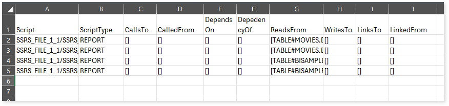 script_report.csv: This report provides detailed lineage information for each script. It lists all scripts along with their type, specifies the processes, entities, or scripts from which each script reads data and those to which it writes, as well as other dependency details.