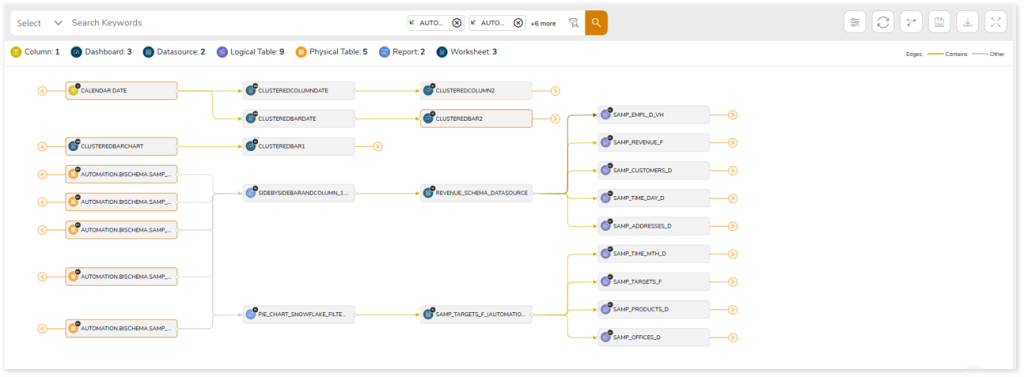 Lineage facilitates you visualize how your selected nodes are connected and depend on each other. The nodes and their connecting edges (relationships) help you to understand the overall structure and dependencies.