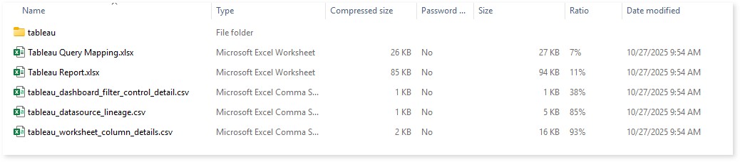 Here, you can see tableau folder along with Tableau Query Mapping.xlsx, Tableau Report.xlsx, tableau_dashboard_filter_control_detail.csv, and tableau_datasource_lineage.csv reports.