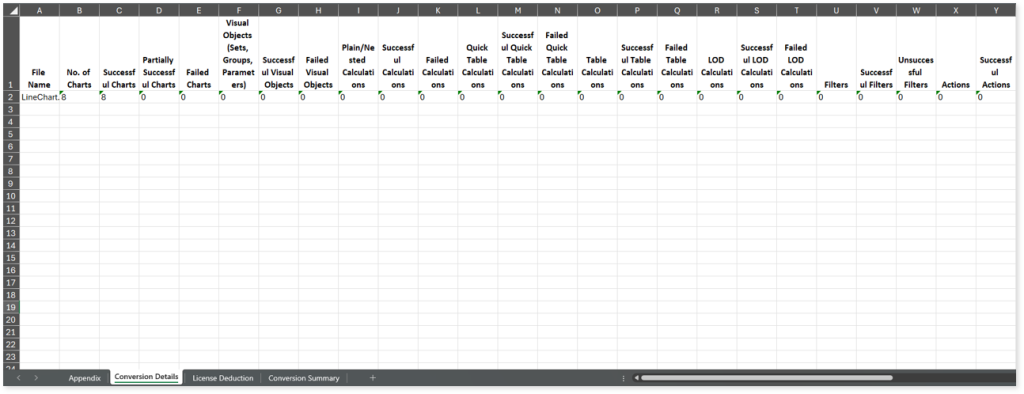 - The Tableau_Conversion_Logs.xlsx report contains information about the components or properties that are not supported in target environment and require manual intervention for successful conversion. In such cases, LeapLogic has implemented alternative logic or methods to convert the source components or properties to the target-equivalent.