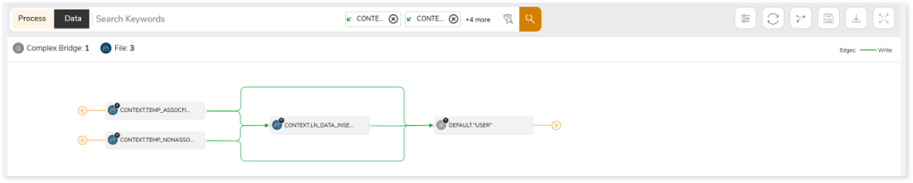 icon allows you to include or exclude particular nodes to obtain the required dependency structure. It helps you quickly narrow down complex dependency graphs to focus on the exact nodes, relationships, or data flows you want to analyze. Instead of navigating through an entire lineage network, you can apply filters based on object names, types, or relationship categories—making it easier to isolate specific tables, workflows, or transformation paths. This feature enhances traceability, reduces visual clutter, and enables you to precisely identify upstream or downstream dependencies that are most relevant to your analysis or migration scope.